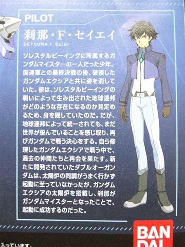 新たに開発されていたダブルオーガンダムは、太陽炉の同調がうまく行かず起動に至っていなかったが、ガンダムエクシアの太陽炉を搭載し、刹那がガンダムマイスターとなったことで、起動に成功するのだった。
